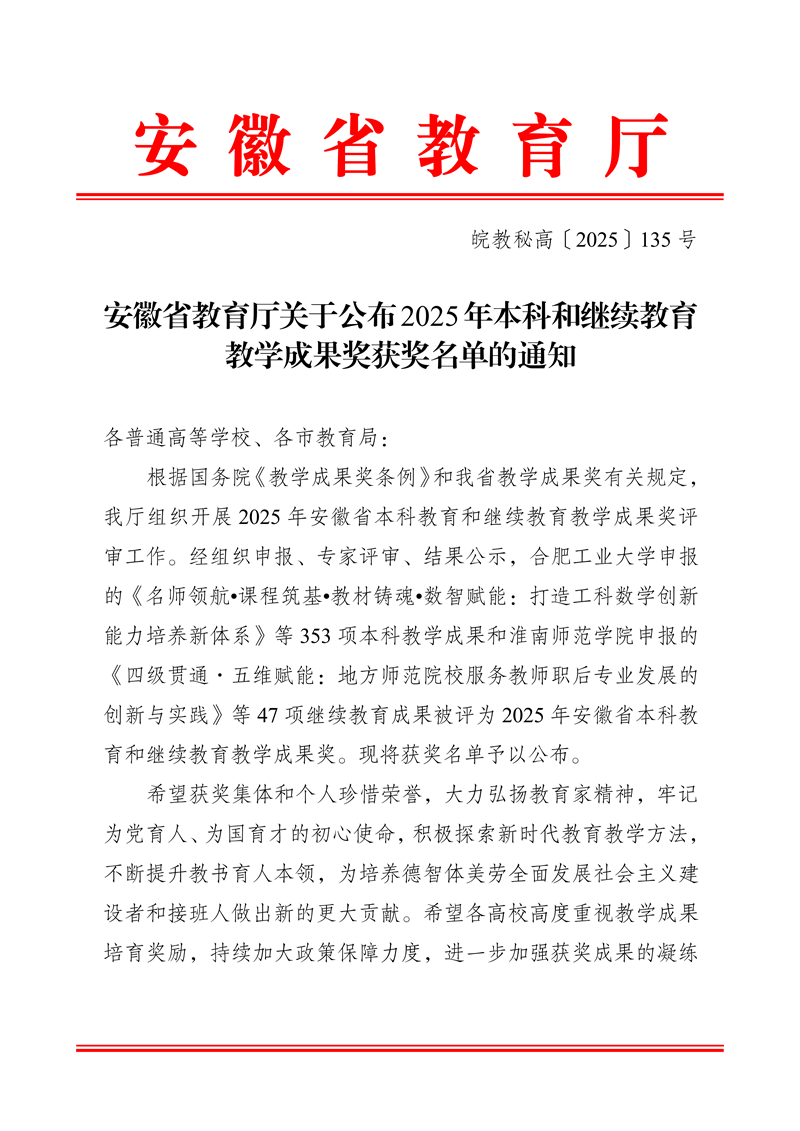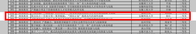 近日,安徽省教育厅公布了2025年本科和继续教育教学成果奖评选结果,由终身教育学院统筹组织申报的《统分结合・价值引领・数智赋能:“国培计划”精准迭代的强师进路》成果获继续教育类二等奖,实现学校继续教育省级教学成果奖零的突破。