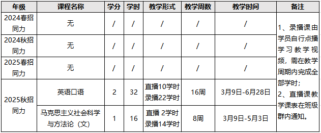 3、专业课程安排。由各培养学院根据培养方案在上述教学周期内安排好本学期专业课程教学活动,并于3月3日(周二)前向同力办报送专业课《教学计划表》和《直播课程表》;同时将教学安排发布到所在专业班级群,通知到学员。